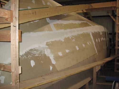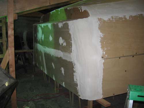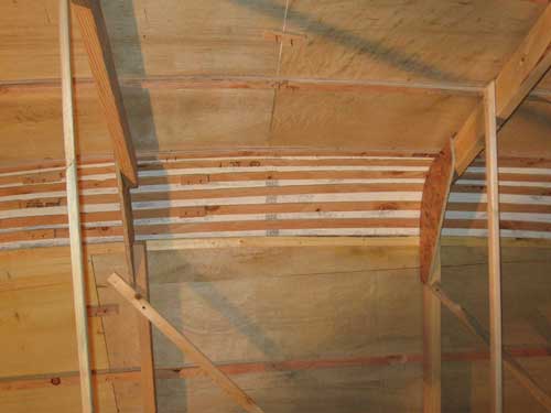 The battens on the chine radi were covered with fiberglass screen, the type used in home screen doors and window screens.