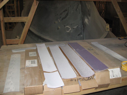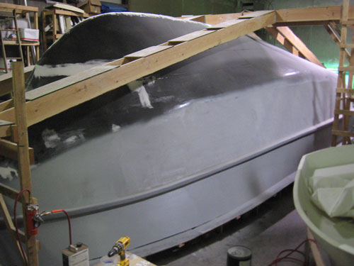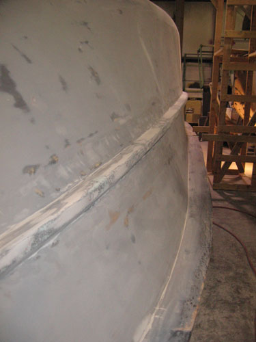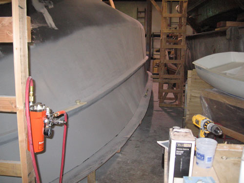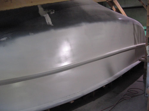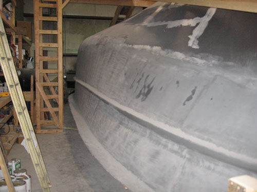 The foam forms were glassed to the plug using epoxy and 1.0oz stitchbound mat. This created a rigid shape fixed to the plug surface to enable application and sanding of fairing compounds without the foam moving. After the rails had cured a layer of epoxy resin pigmented black was rolled on the entire plug to seal the wood and drywall surfaces. This was then sanded smooth (though not necessarily fair). Layers of fairing compound (epoxy with microballoons) and high build primers were applied over the rails and upper hull surfaces, followed by sanding and reapplications an needed. Sanding was mostly board sanding by hand with progressively less aggressive grits. Some power sanding with the Festool RO 150 ETS was also appropriate in certain regions. After many alternating layers, a double coat of AwlGrip Ultra High Build Epoxy Primer was applied to help fill in the remaining small defects. This material also cures to a difficult to sand surface after abour 48 hours. This was helpful to prevent following fairing compound sanding from cutting into already fair sections. It's white color also contrasted with the greys of the high build primers. After acceptably fair, the upper and lower 2.5"R fillets on the rails were created, again using epoxy with microballoons. Several applications of compound was necessarily. First thick to hold the proper shape without sagging during curing, then progressively thinner to fill in the roughness of the thicker layers and create a smoother surface. Then more sanding ensues. Once the fillets are close a double shot of high build primer was applied to fill any minor voids and defects remaining in the fillets and rub rail surfaces. After a final sanding and inspection a layer of Red Oxide sealer will be applied (not yet completed, refer to next progress posting comming soon).