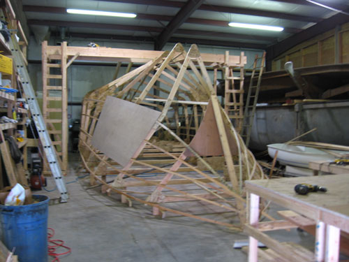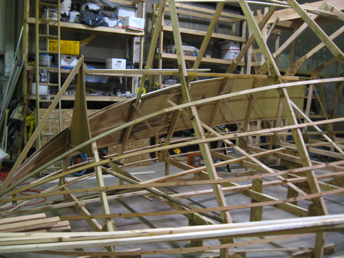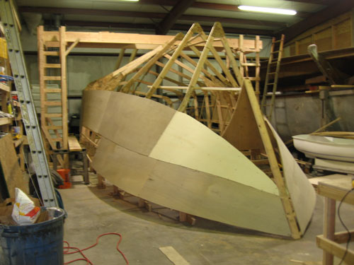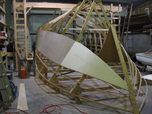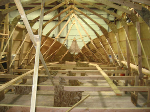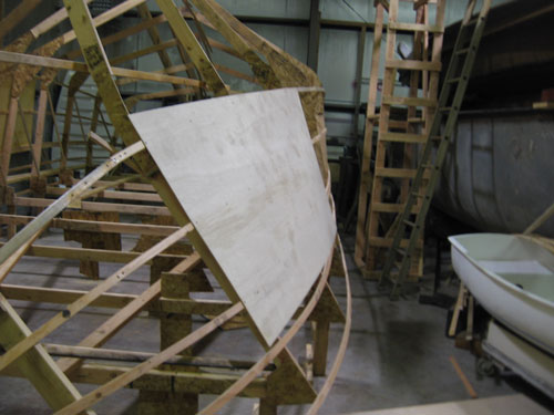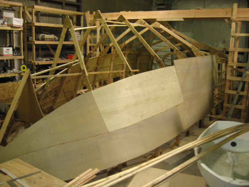 Battens are fastened to the frames, and sheeting is screwed to the battens. Each sheet is marked, removed, cut, fit, and permanently mounted in place.
